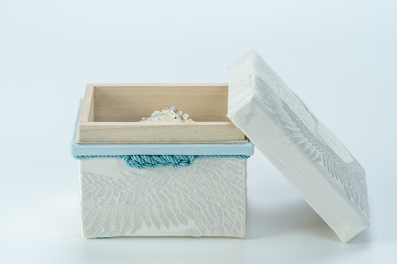 水色の縁取りにスカイブルーの飾り紐を使用。シンプルですっきりとした一品。内箱のリングピロー部分は白いお花をモチーフ。